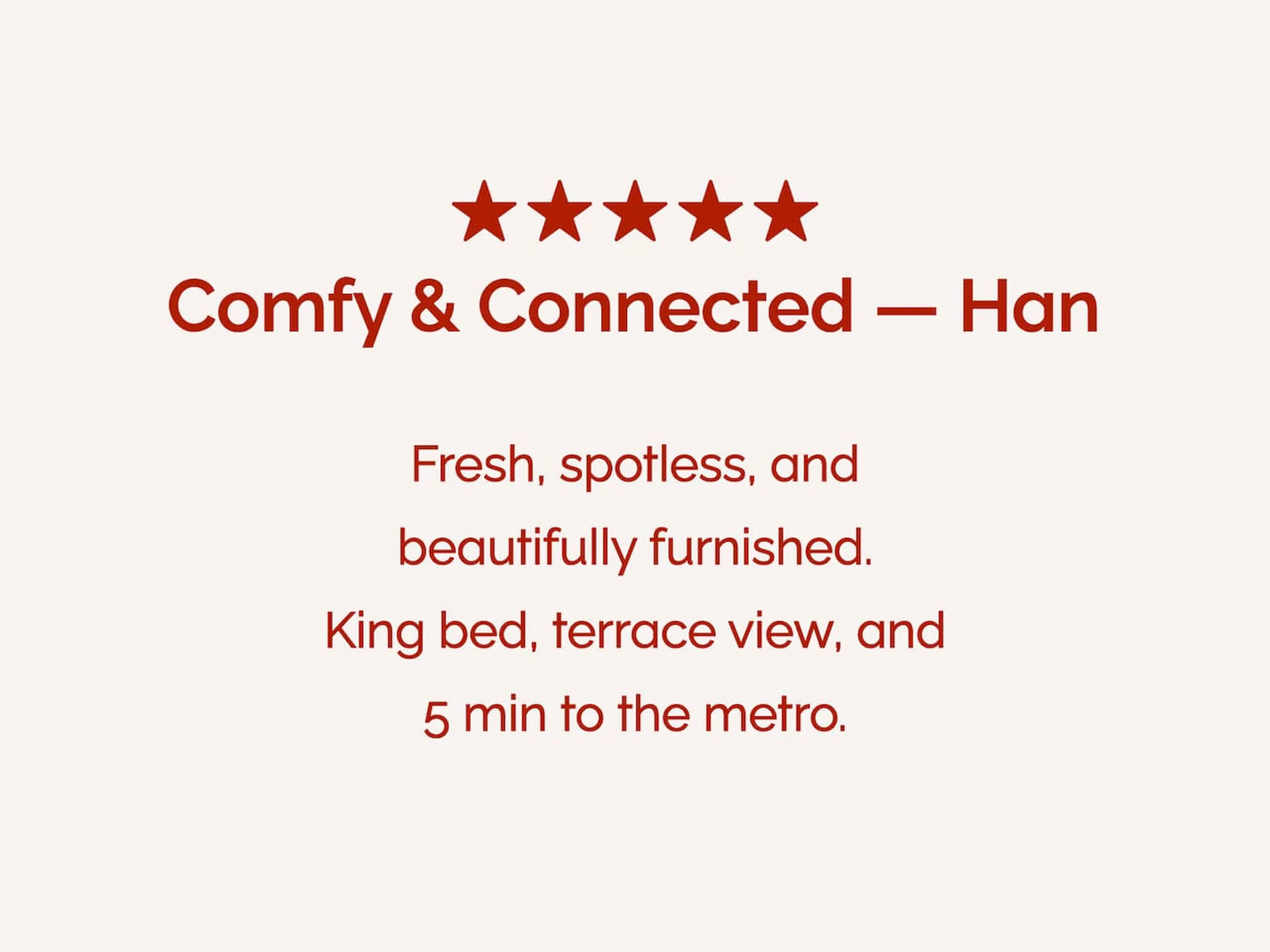 Positive: Thank you so much for the exceptional stay. The view from the balcony was unique. The accommodation is close to the metro and the marina. Communication was truly excellent. We would definitely recommend this accommodation.